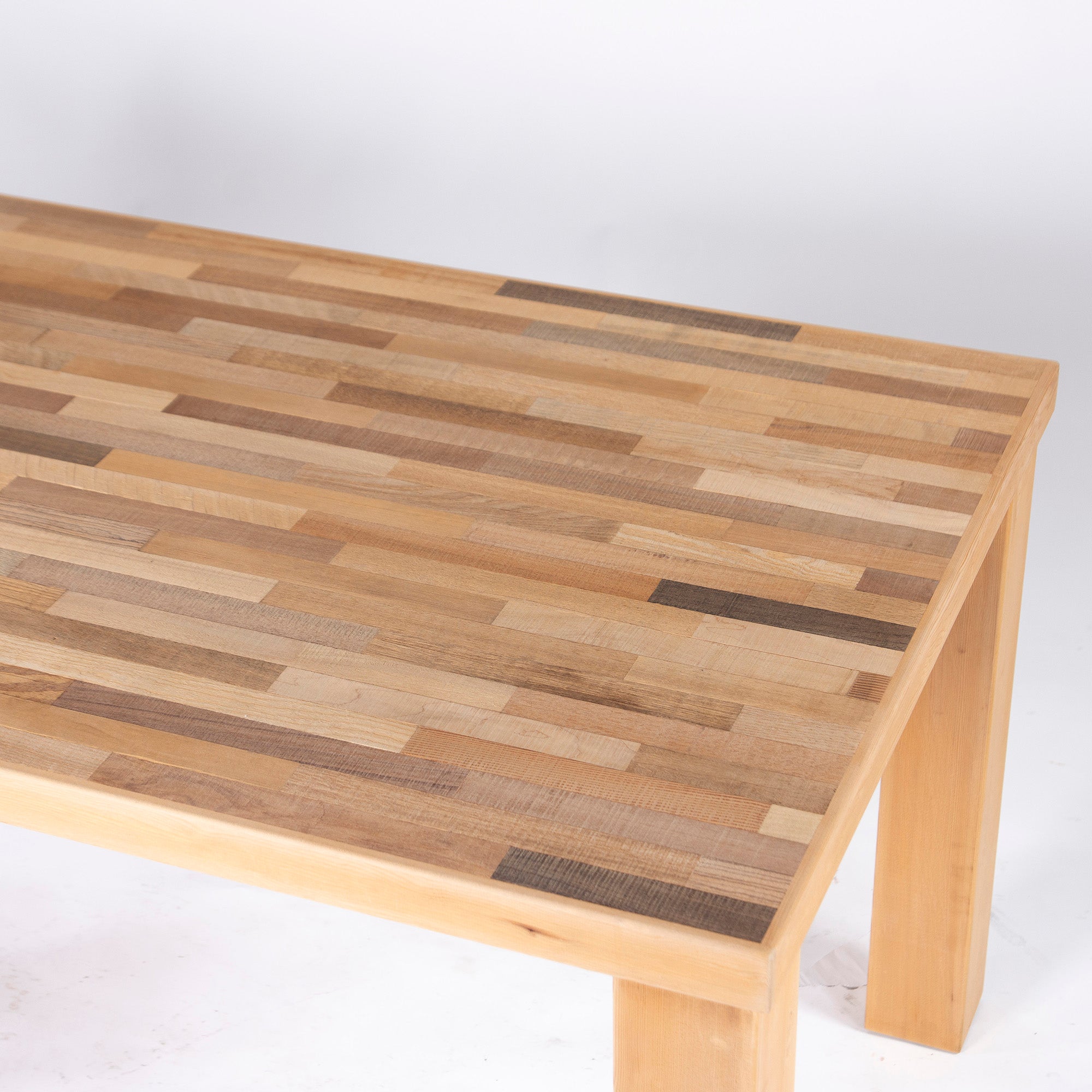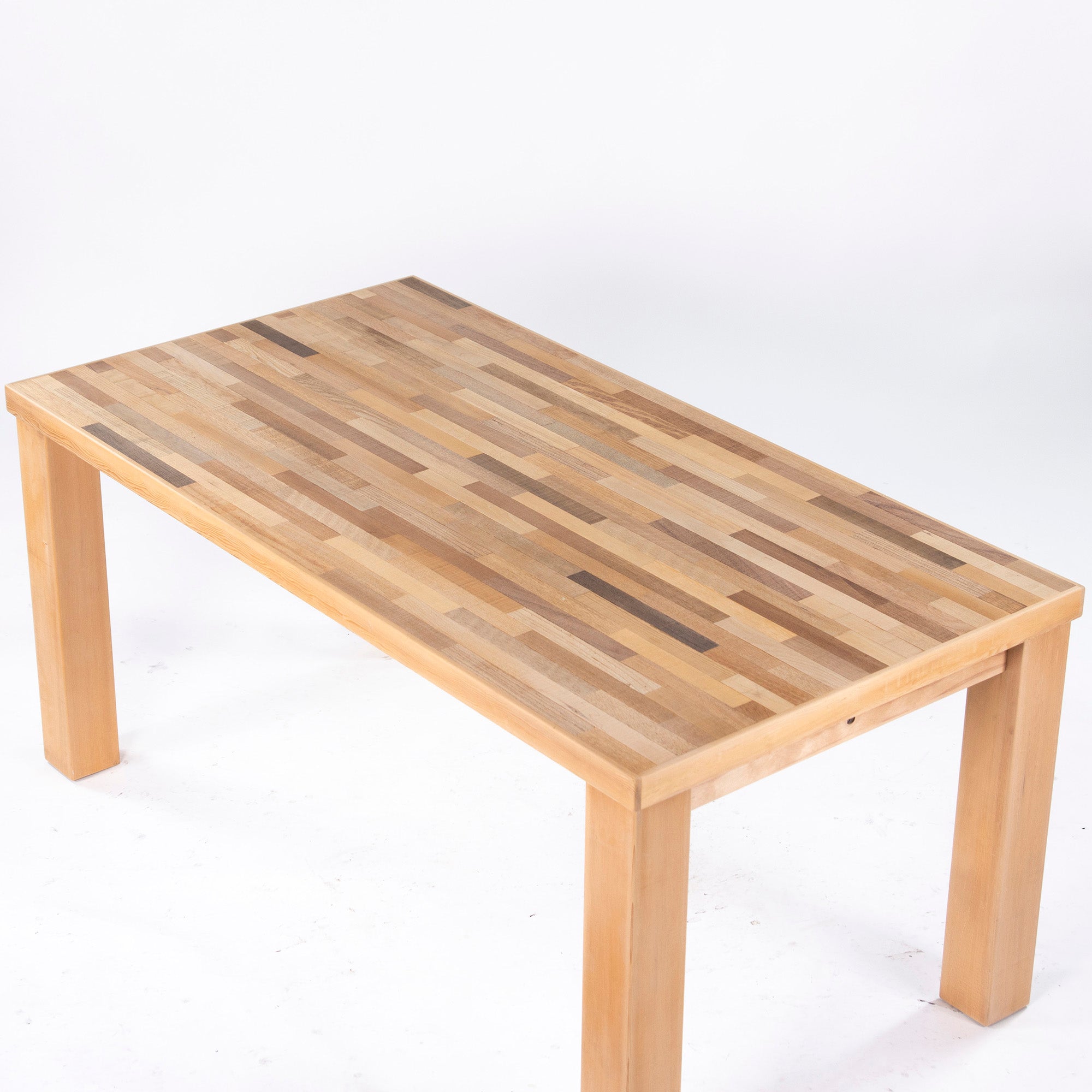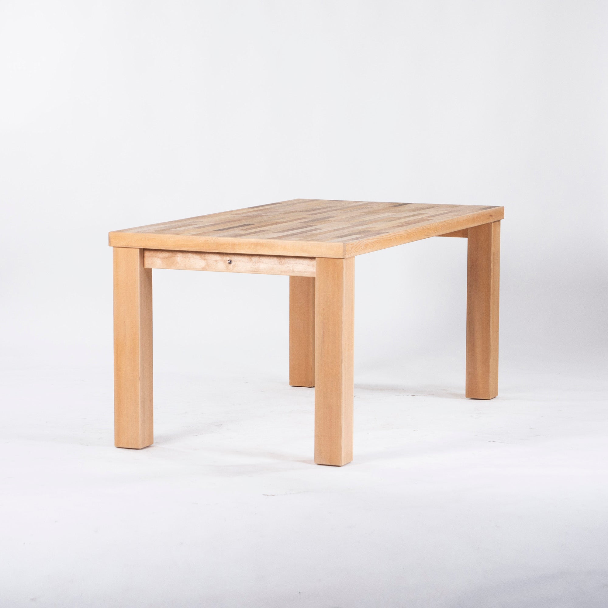 This table has an attractive top made from several types of thinned wood, including oak, ash, and cedar, laid together like parquet.
